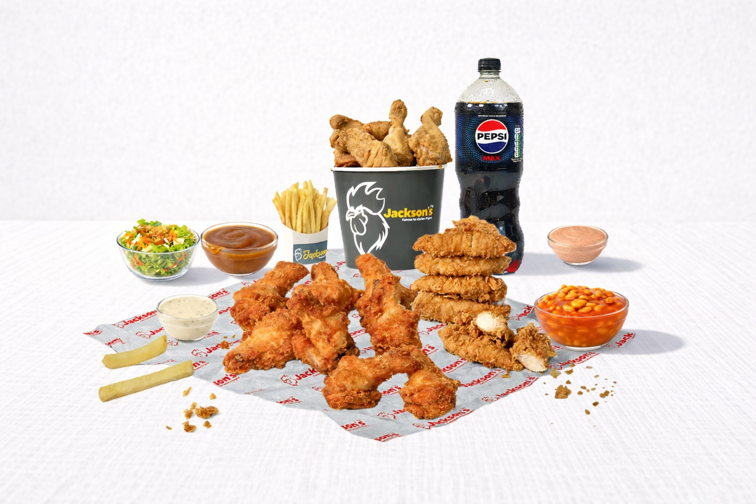 Enjoy 10 or 14 pieces of our classic chicken with 8 hot wings, 6 boneless strips, and a large popcorn chicken (24 pieces), served with 2 reguler sides, 4 regular fries, 2 house dips, and a 1.5 litre drink — a truly generous feast.
